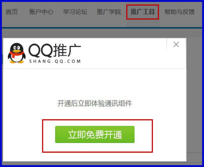 二、用你的QQ賬號登陸之后,點“推廣工具”,按下圖所示,點擊“立即免費開通”。這個必須開通,否則不能臨時會話,就會顯示“未啟用”。這一步是關(guān)鍵,必須開通。
