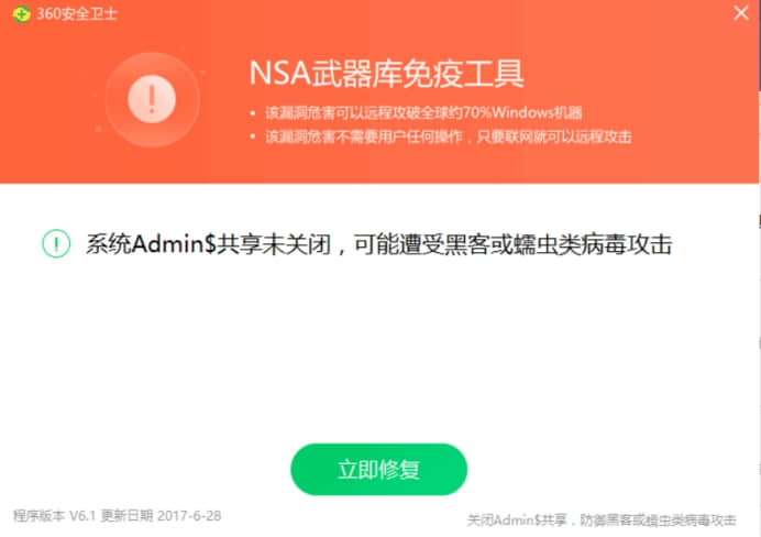 4. 安裝好NSA免疫工具后,它會讓您立刻修復(fù).點(diǎn)擊立刻修復(fù).