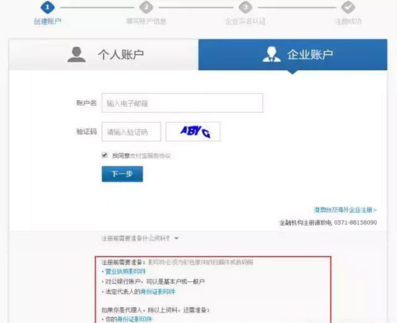 第三步:選擇"企業(yè)賬戶",按照要求輸入郵箱和后面顯示的驗證碼,完成后點擊下一步。紅色框選部分要特別注意,包括企業(yè)營業(yè)執(zhí)照和對公銀行賬戶等資料的準(zhǔn)確性。