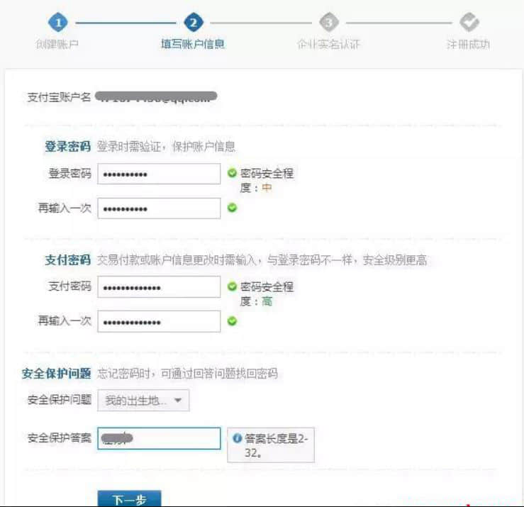 **步:按要求設(shè)置“登錄密碼”、“支付密碼”和“安全保護(hù)問題”(密碼設(shè)置**使用數(shù)字、字母、符號的組合,增強(qiáng)安全系數(shù),自己設(shè)置的問題要記得答案),完成后點擊下一步。