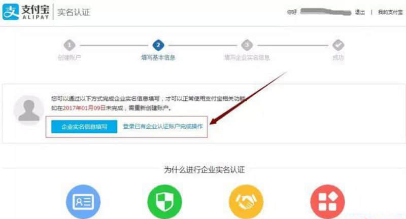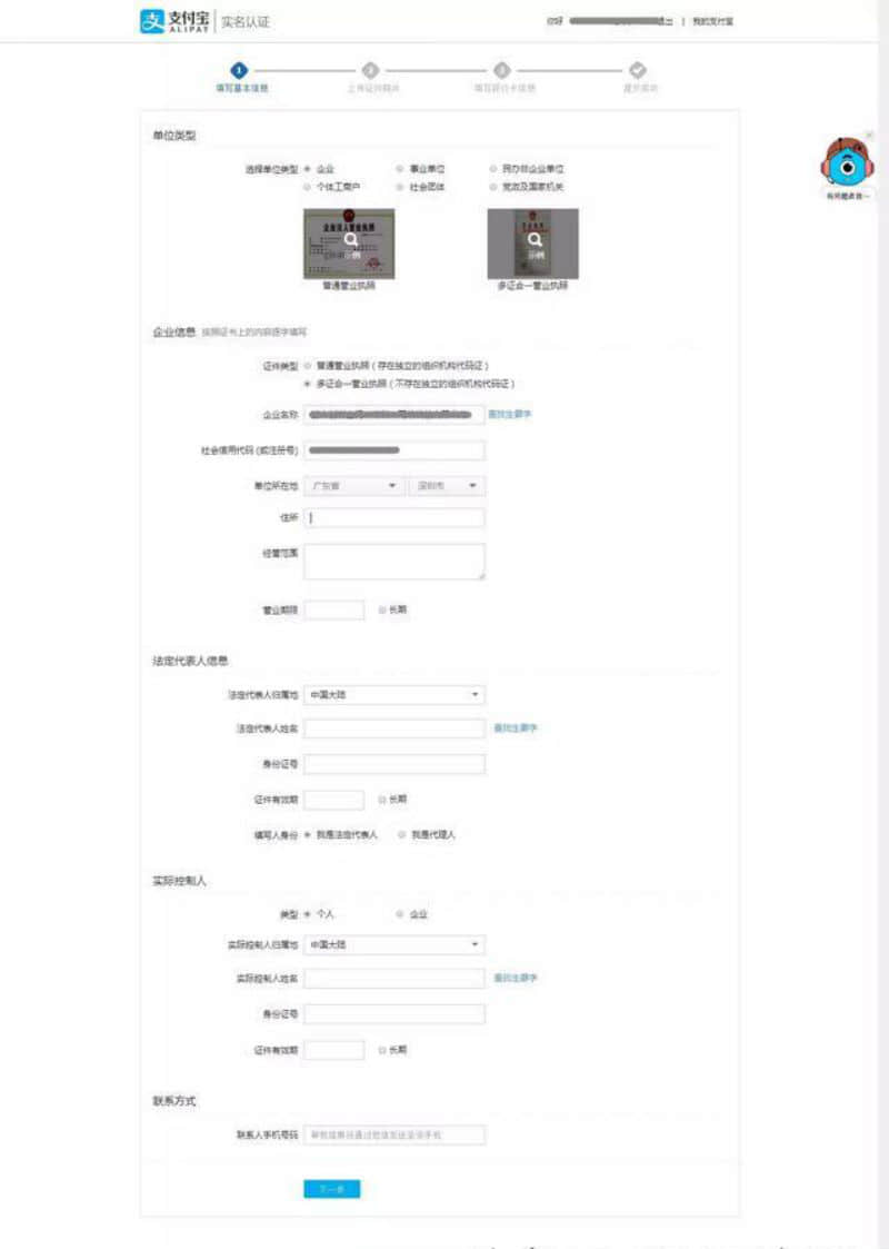 第二步:支付寶賬戶信息填寫完之后,進(jìn)入企業(yè)實名信息填寫。